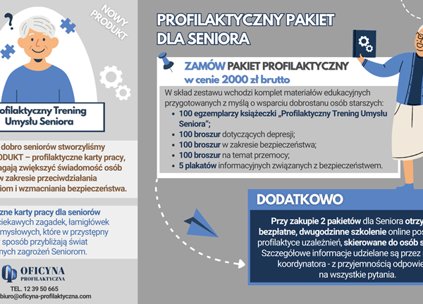 Profilaktyczne łamigłówki to książeczka łącząca intelektualną rozrywkę z profilaktyką zdrowia psychicznego oraz problemów społecznych. Zawiera atrakcyjne dla seniorów ćwiczenia umysłowe m.in. krzyżówkę, wykreślankę, rebus i zagadki logiczne – które w przystępny sposób angażują uwagę i wspierają działania prewencyjne.